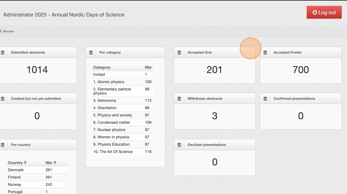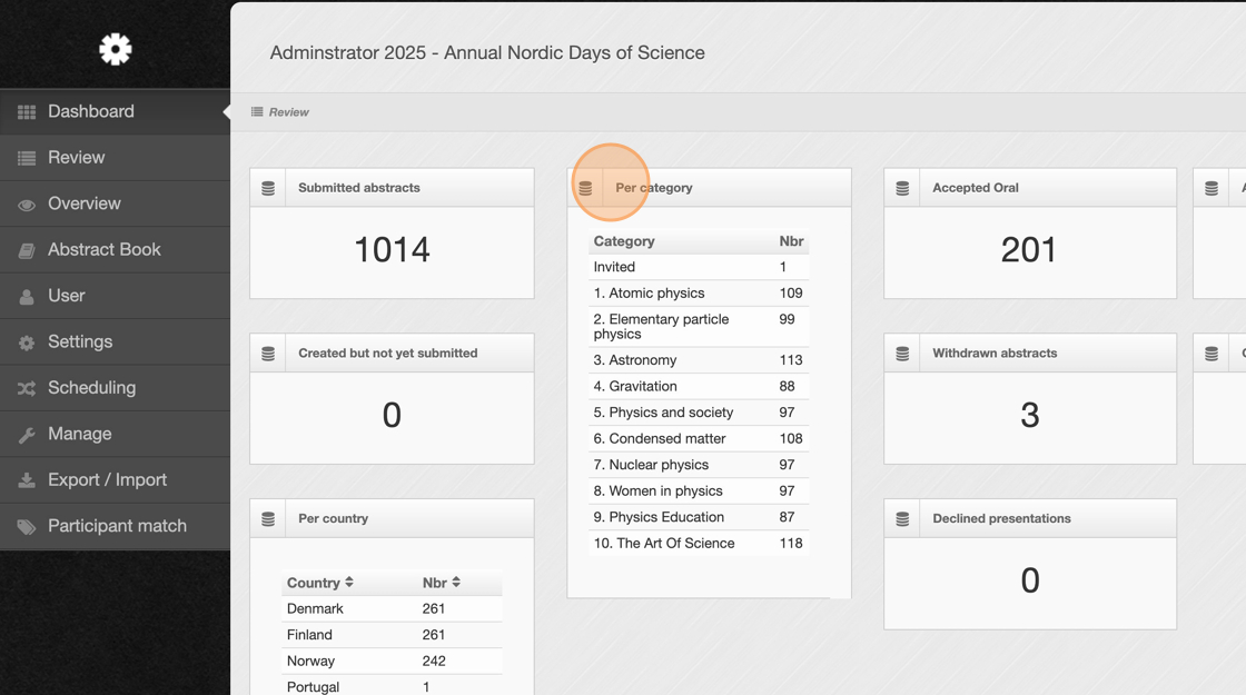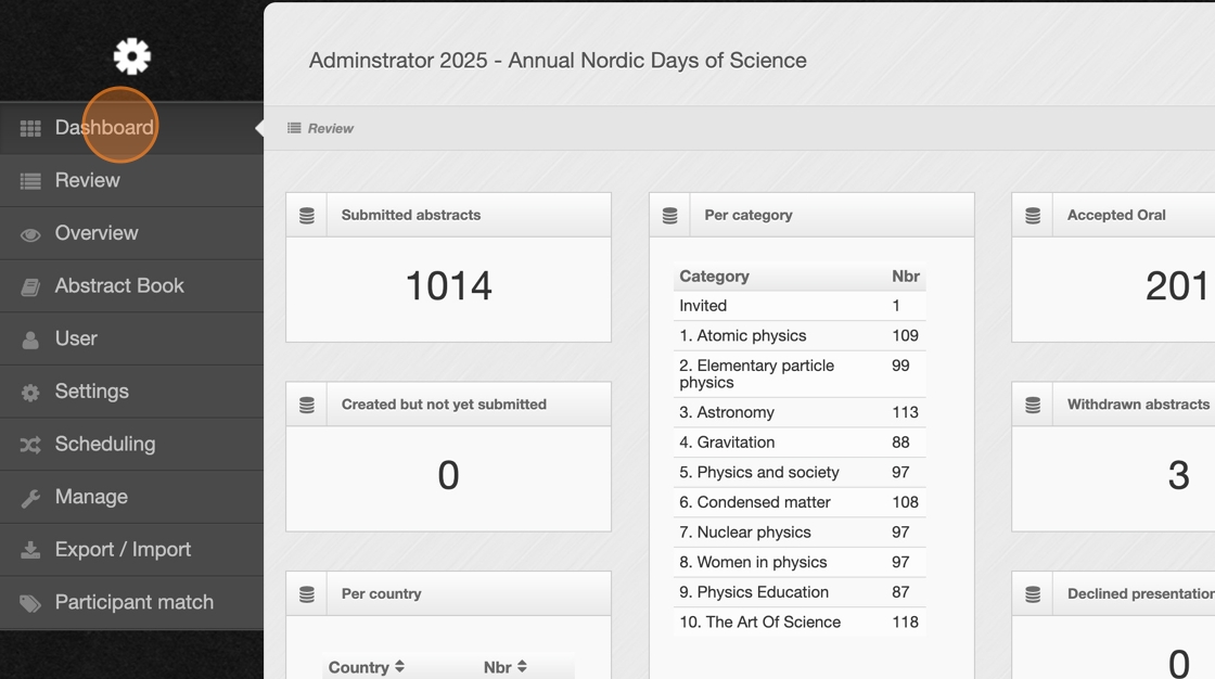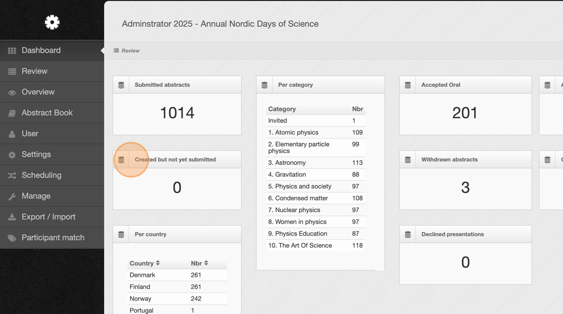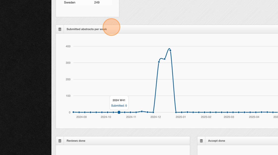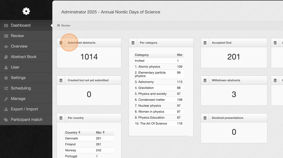 2. At the top of the dashboard, check the total number of abstracts that have been submitted. This gives you a quick snapshot of overall submission activity.
