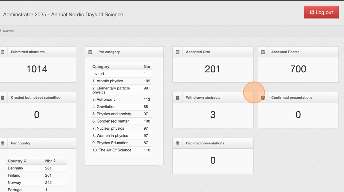 6. Additional sections show withdrawn abstracts. If the "Confirm presentation" feature was used in notification emails, the dashboard also displays each presentation’s status — confirmed or declined.
