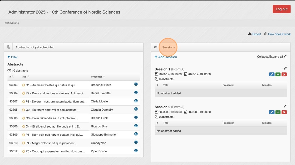 5. Drag and drop abstracts from the left panel into the desired session on the right.