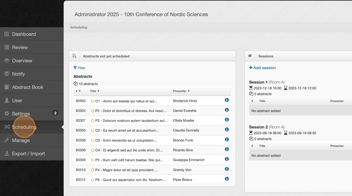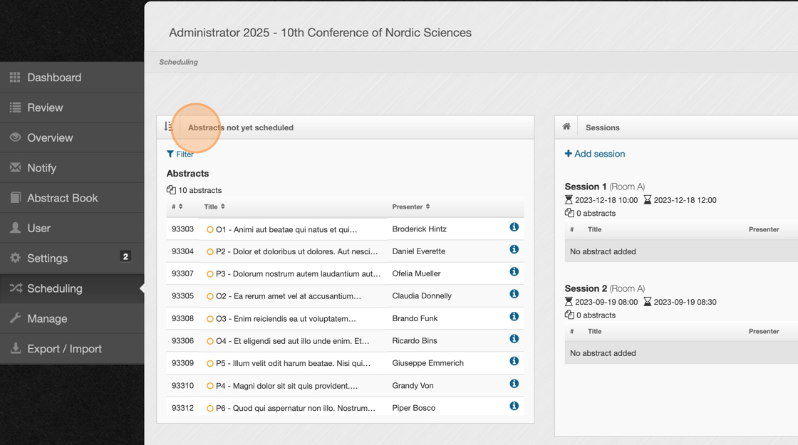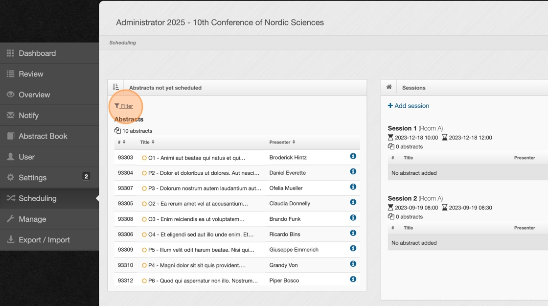 This guide explains how to efficiently schedule abstracts into sessions using drag-and-drop. It also demonstrates how to find the abstract filtering option to simplify the scheduling process.