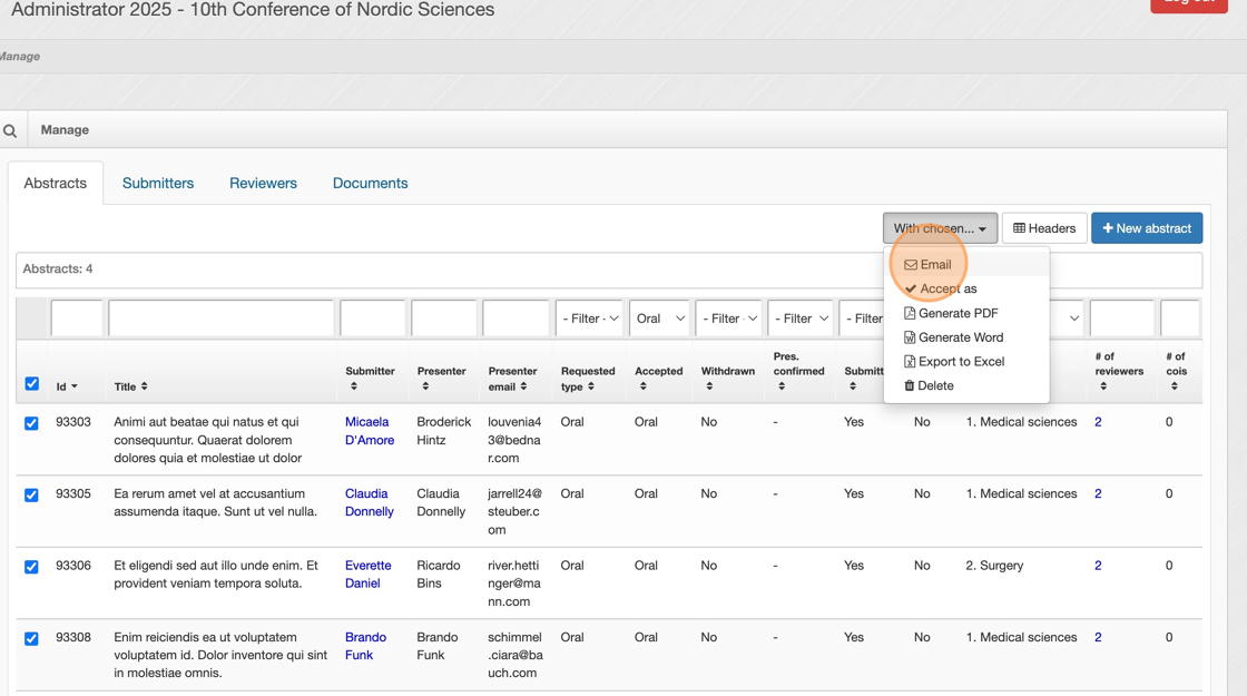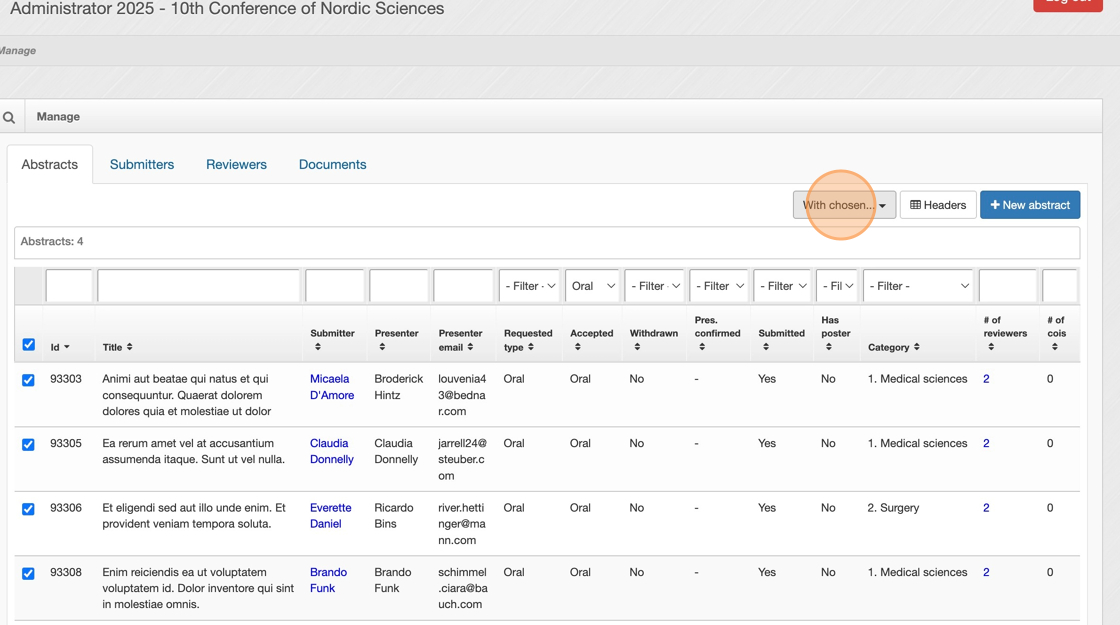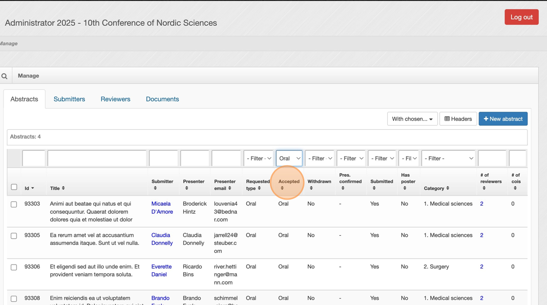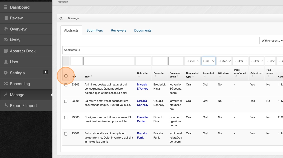2. Use the available headers to filter abstracts and determine which authors you want to notify. Read this article to learn more about filtering in the Manage section.