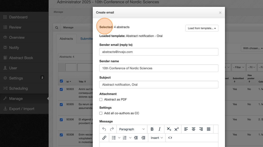 This guide walks you through the process of sending notifications to authors using the Manage section, helping you efficiently communicate important updates such as acceptance or presentation details.