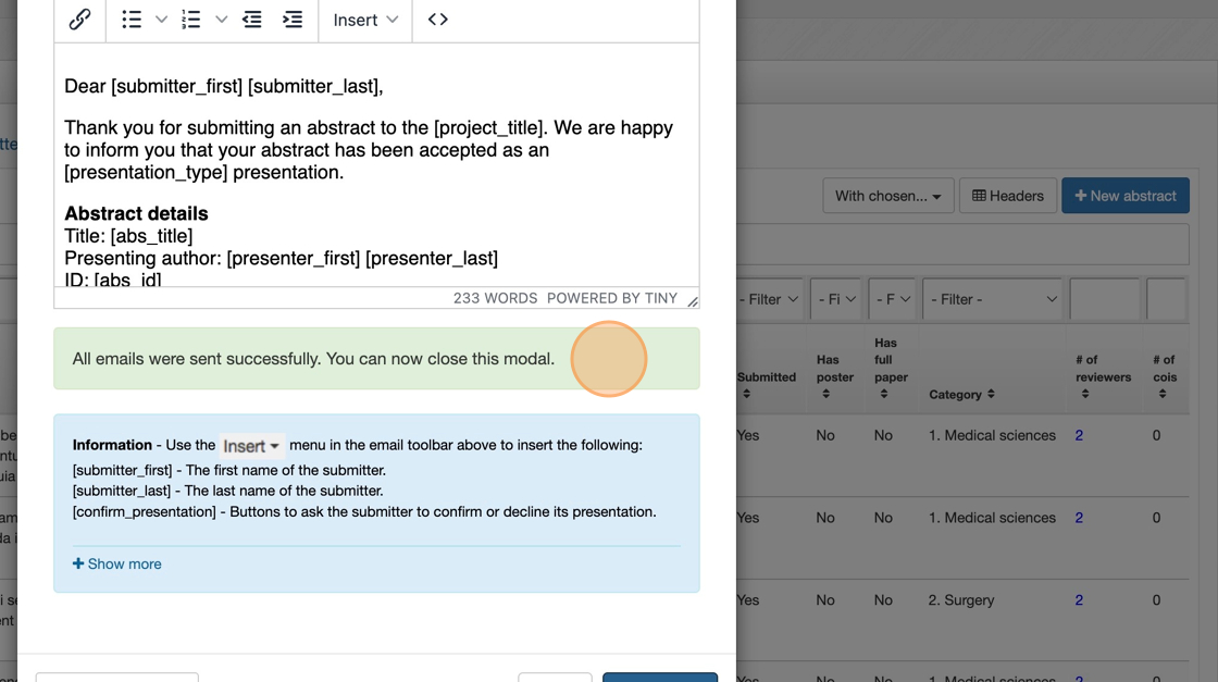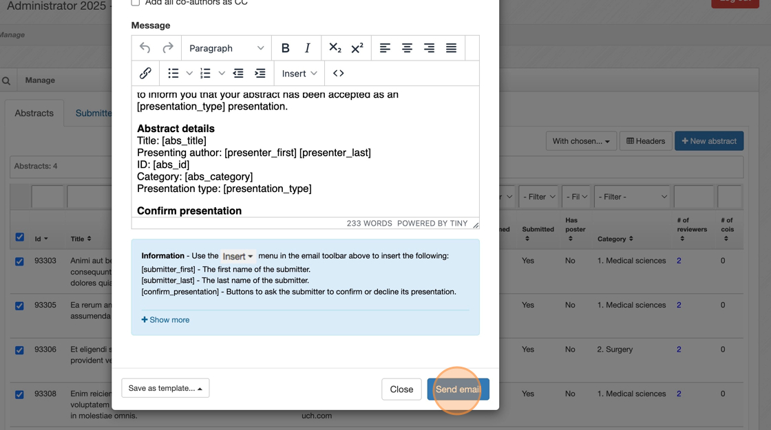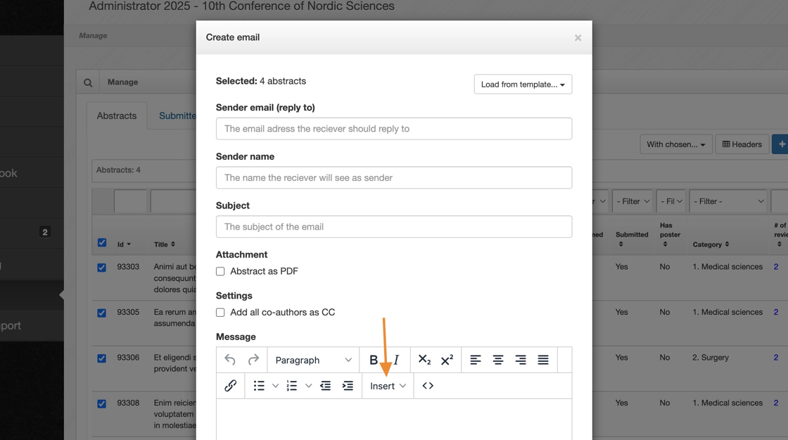 ℹ️ To personalize your emails and collect information about the abstract authors, you can use system variables like [submitter_first] and [submitter_last] to automatically insert their names. To add these variables, click on ‘Insert’—the button highlighted by the arrow in the image below.