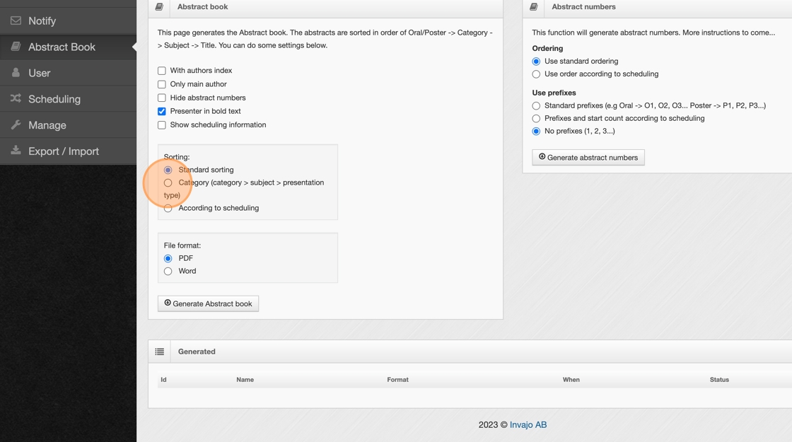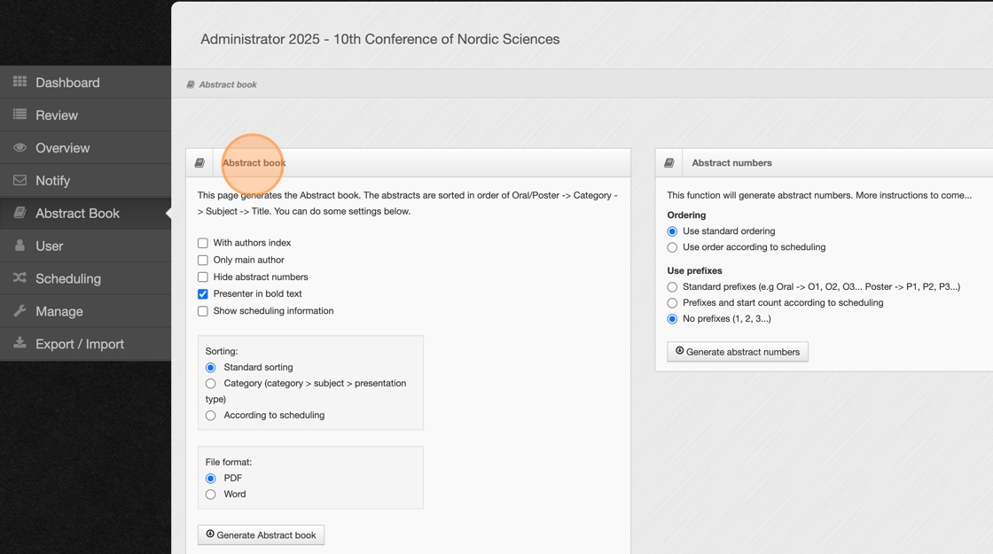 2. Here, you can adjust various settings before generating the abstract book.