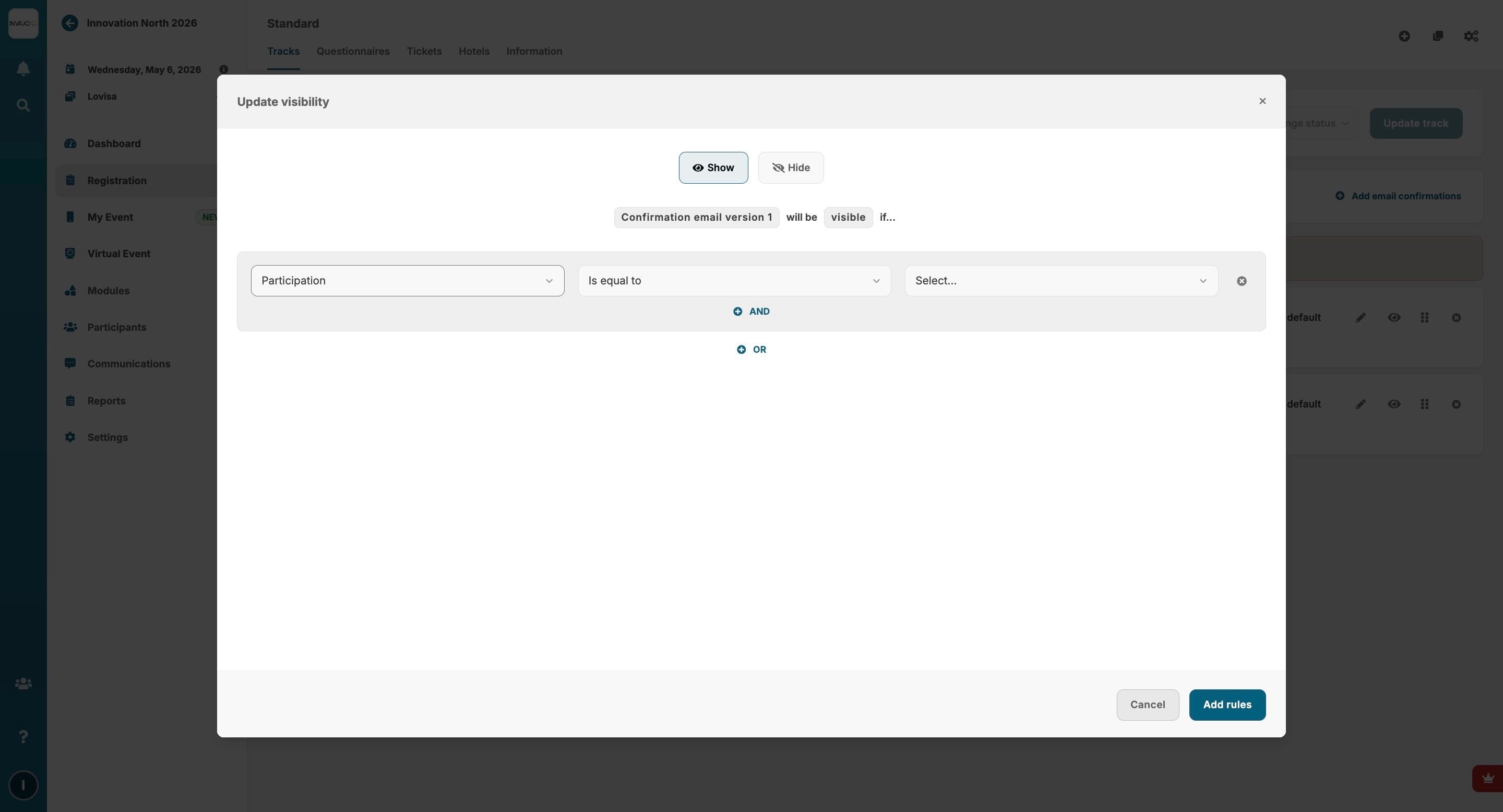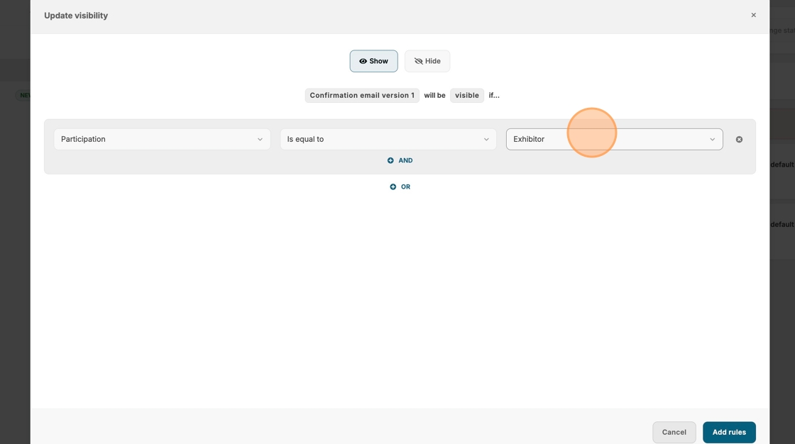 12. Set your visibility rules to ensure that the right group of participants gets the right email. In this case, we will base it on how they identify their participation.