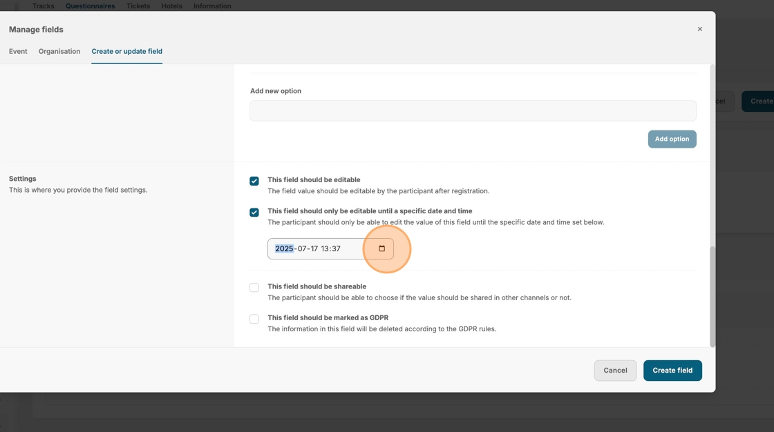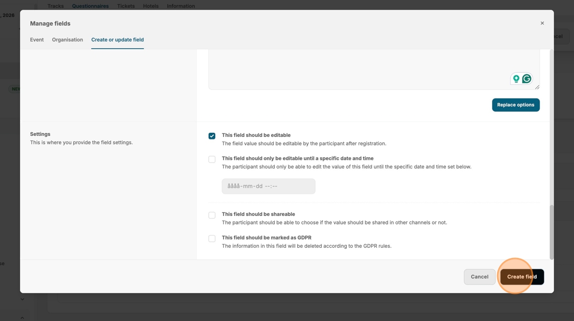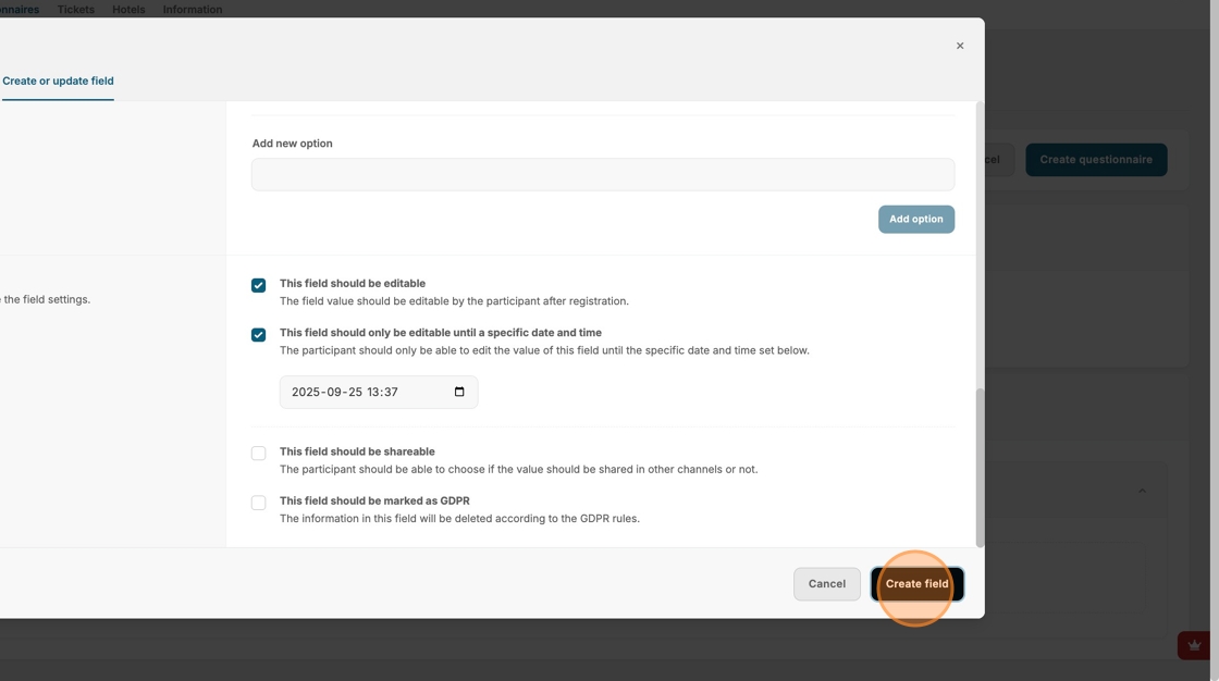 20. Click "Create field" to save this question.