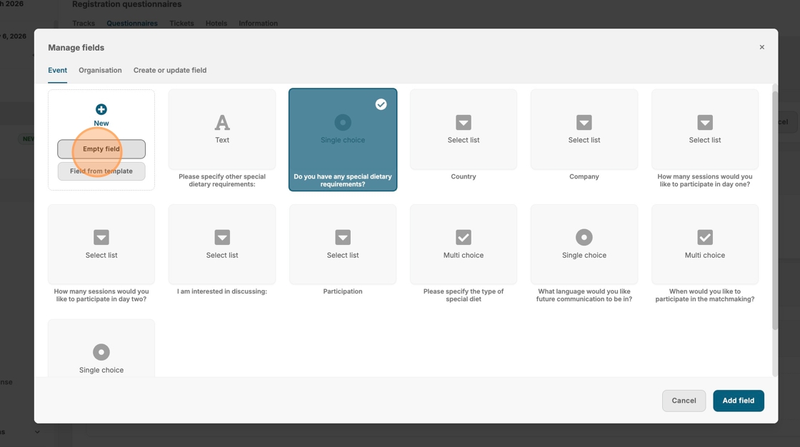 10. Click "Empty field" to create a new question.