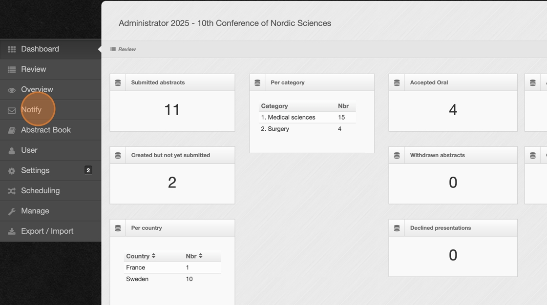 1. To view the email log of all messages sent through the system, navigate to "Notify".