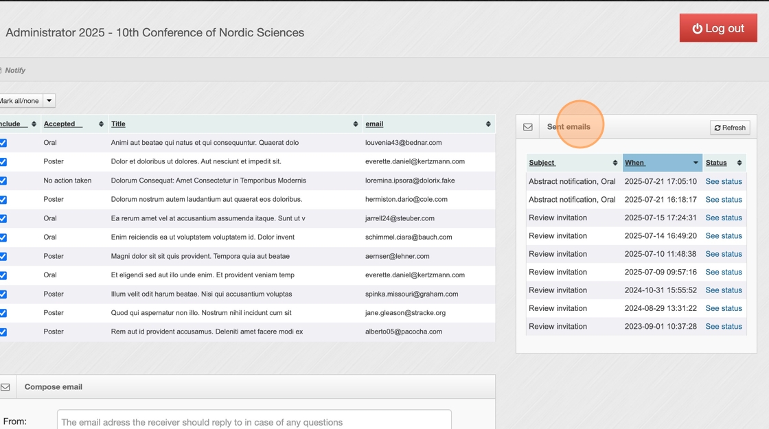 2. On the right side of the page, you’ll find a window displaying sent emails, including the subject and the date sent. Click the "See status" link to view the email and its status.