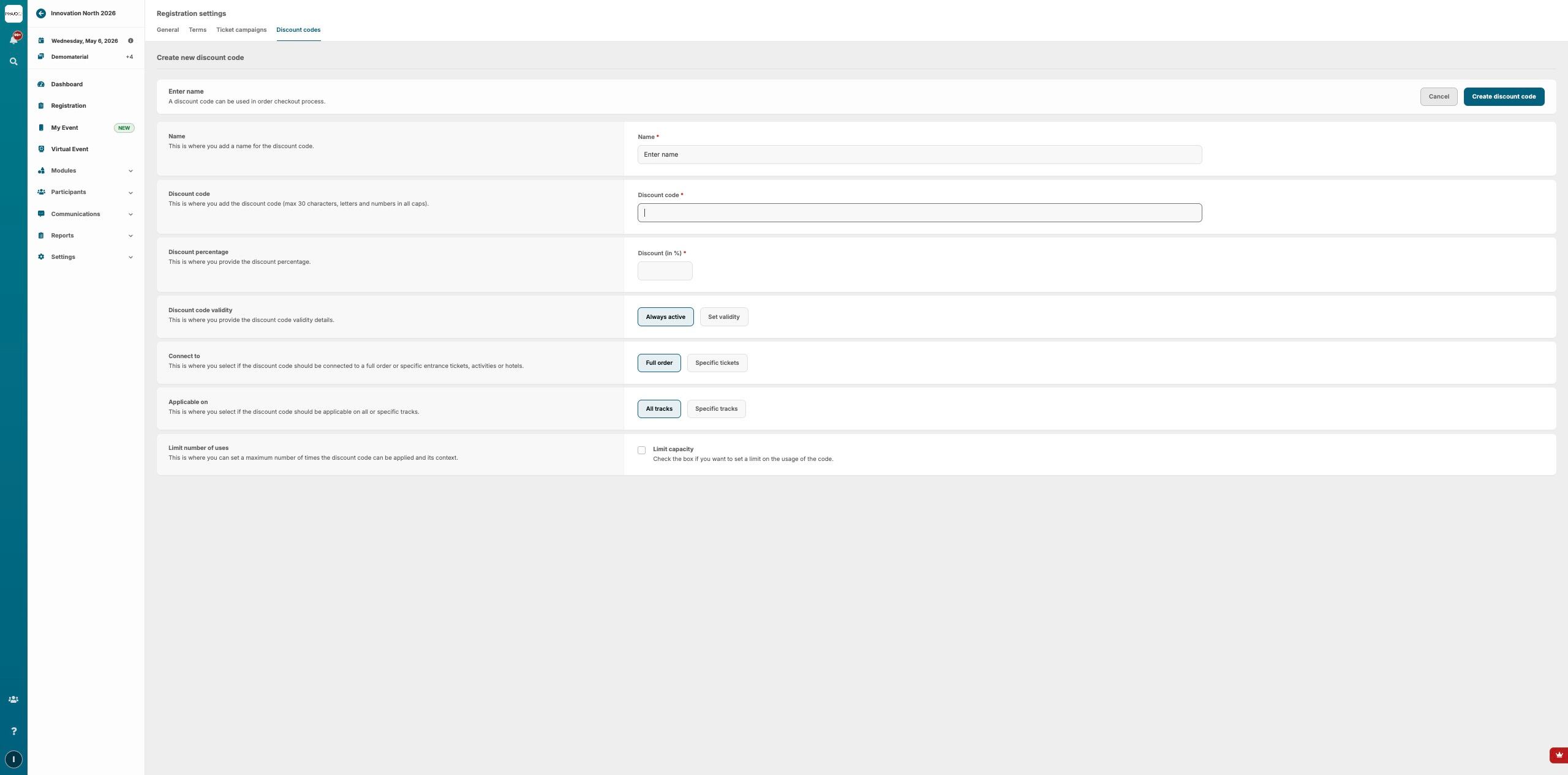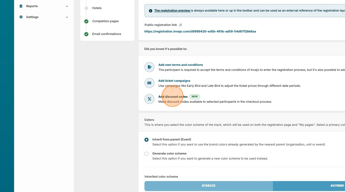 21. You can access the discount code settings at any time via the left-side menu by navigating to "Settings" → "Registration" → "Discount codes"