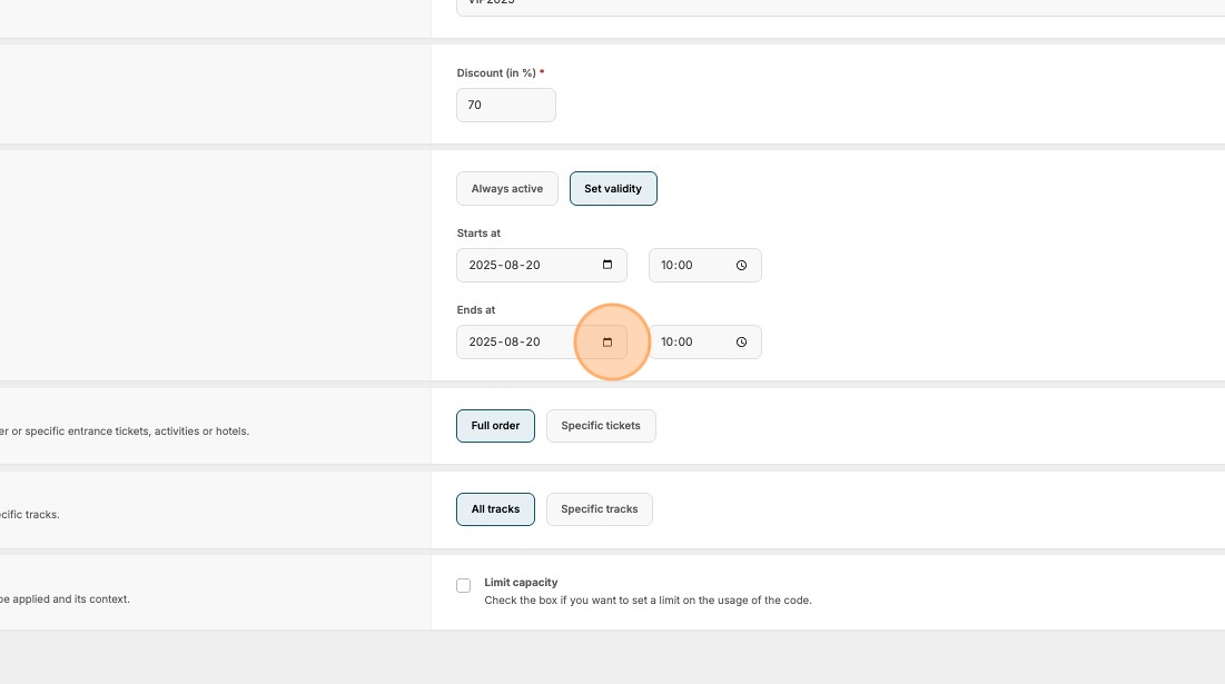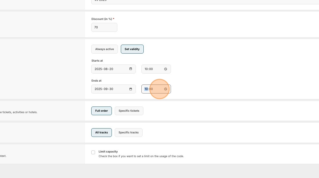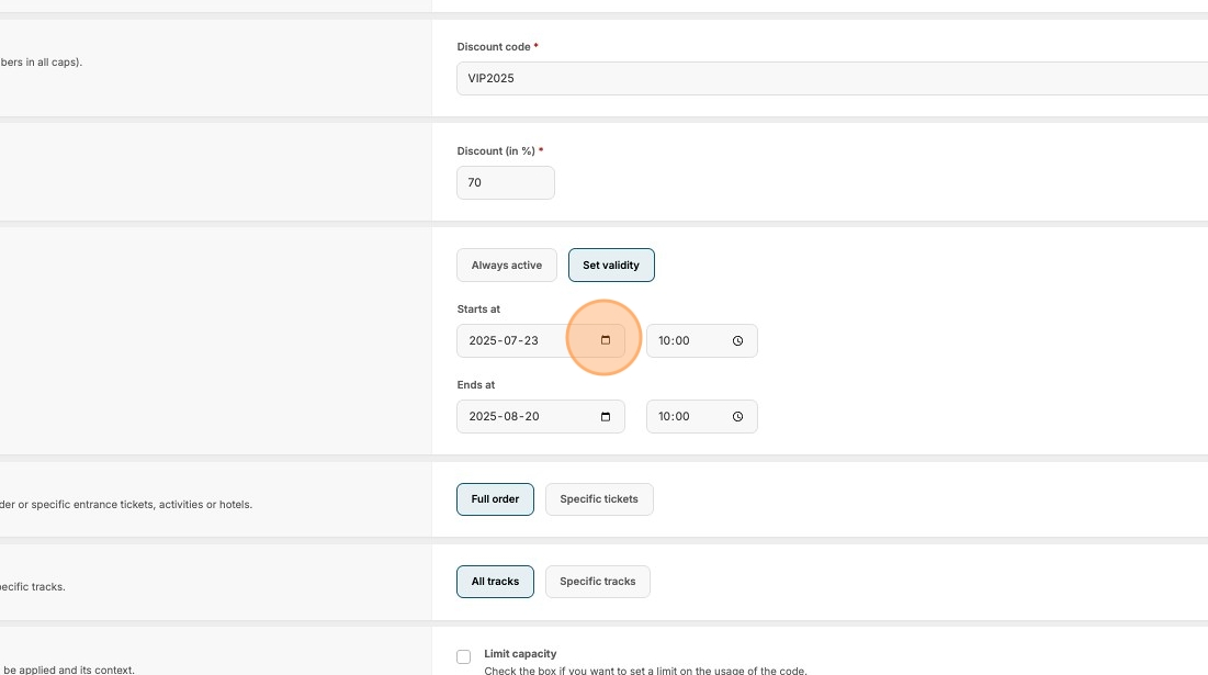 10. Click the "Starts at" field to choose when the code becomes valid.