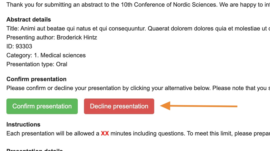 1. This option can be added to the acceptance email, allowing authors to confirm or decline their presentation. Note that this is an additional step for planning purposes, and authors are still required to register for the conference.