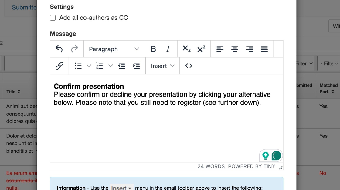 Learn how to add confirmation options to the acceptance email, allowing authors to confirm or decline their presentation. This step supports planning but does not replace conference registration.