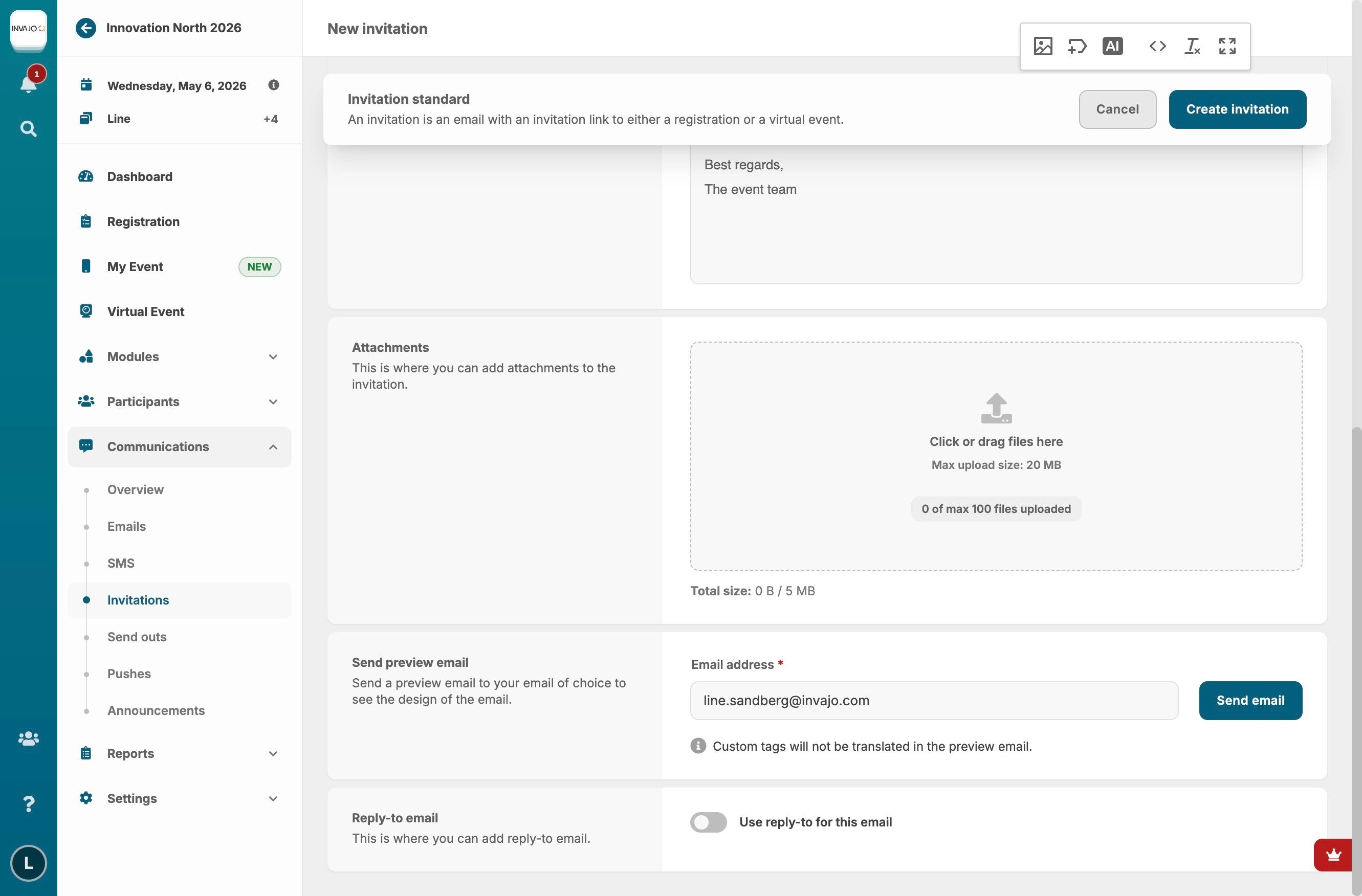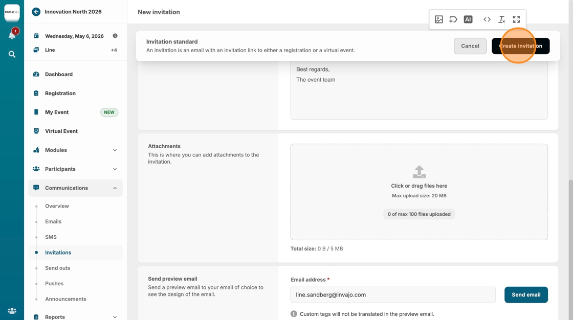 15. You can add attachments to the invitation by clicking or dragging files into this area