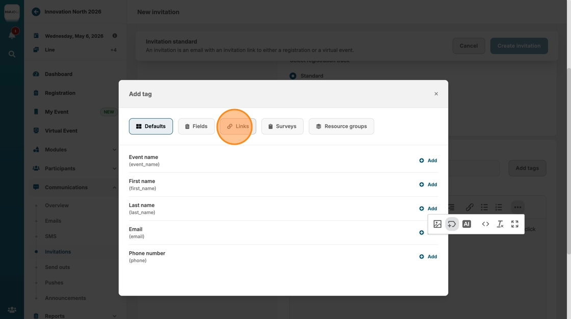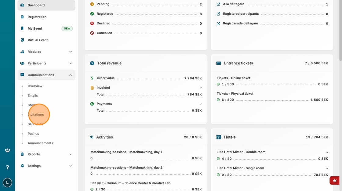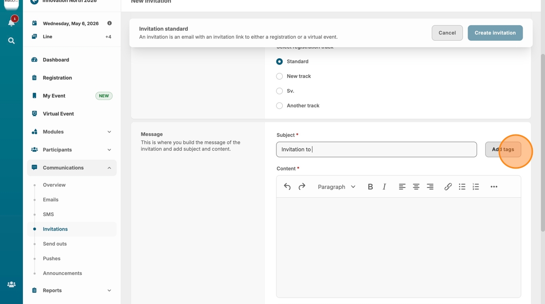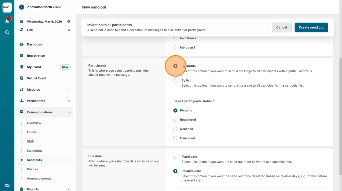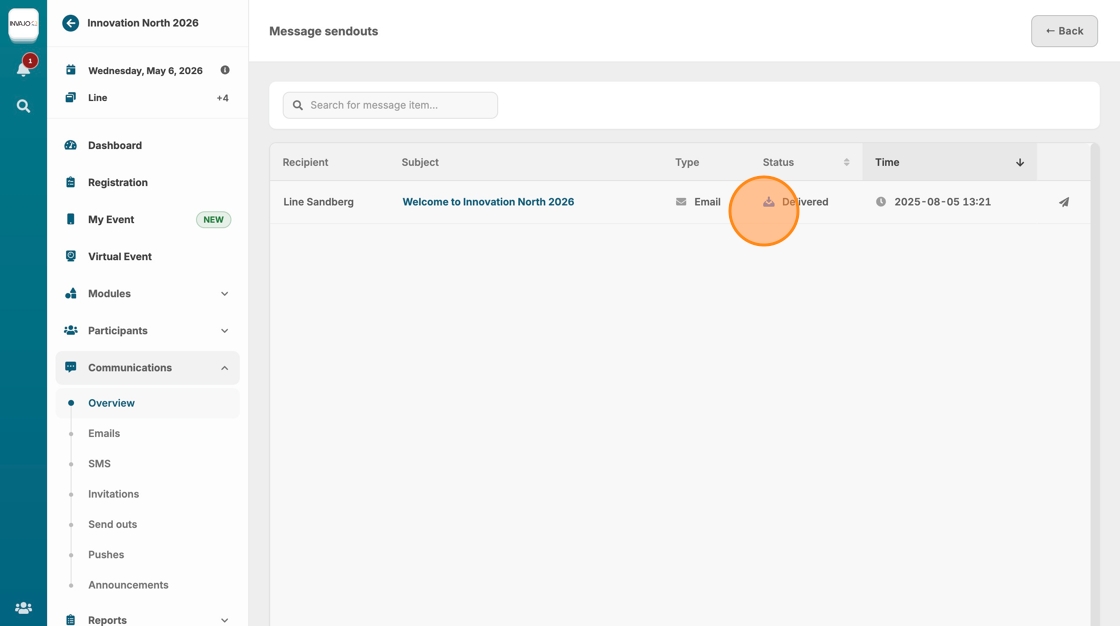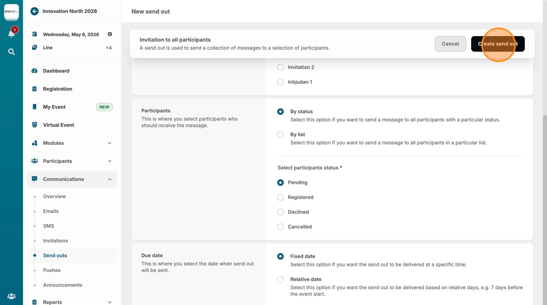 This guide shows how to create and send invitations for events using the communication module. Learn how to build your invitation, customize the message with event tags, and either schedule it or send it immediately to the right participants. It also shows how to track the delivery status for each recipient.