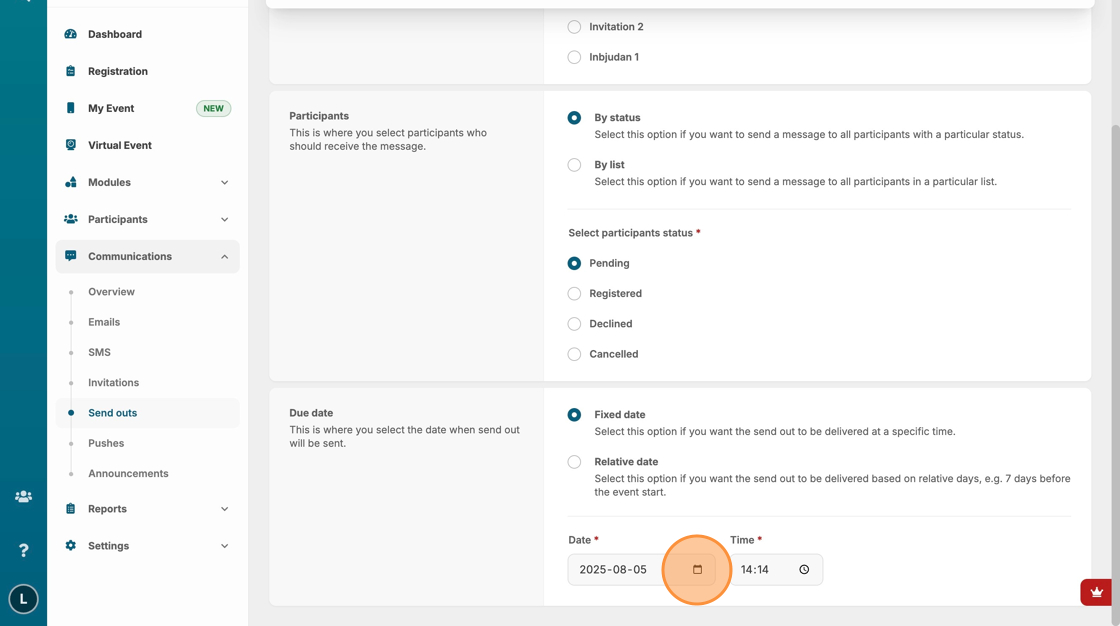 Alternatively, choose "Relative date" if you want the send out to be delivered based on relative days, e.g. 7 days before the event start.