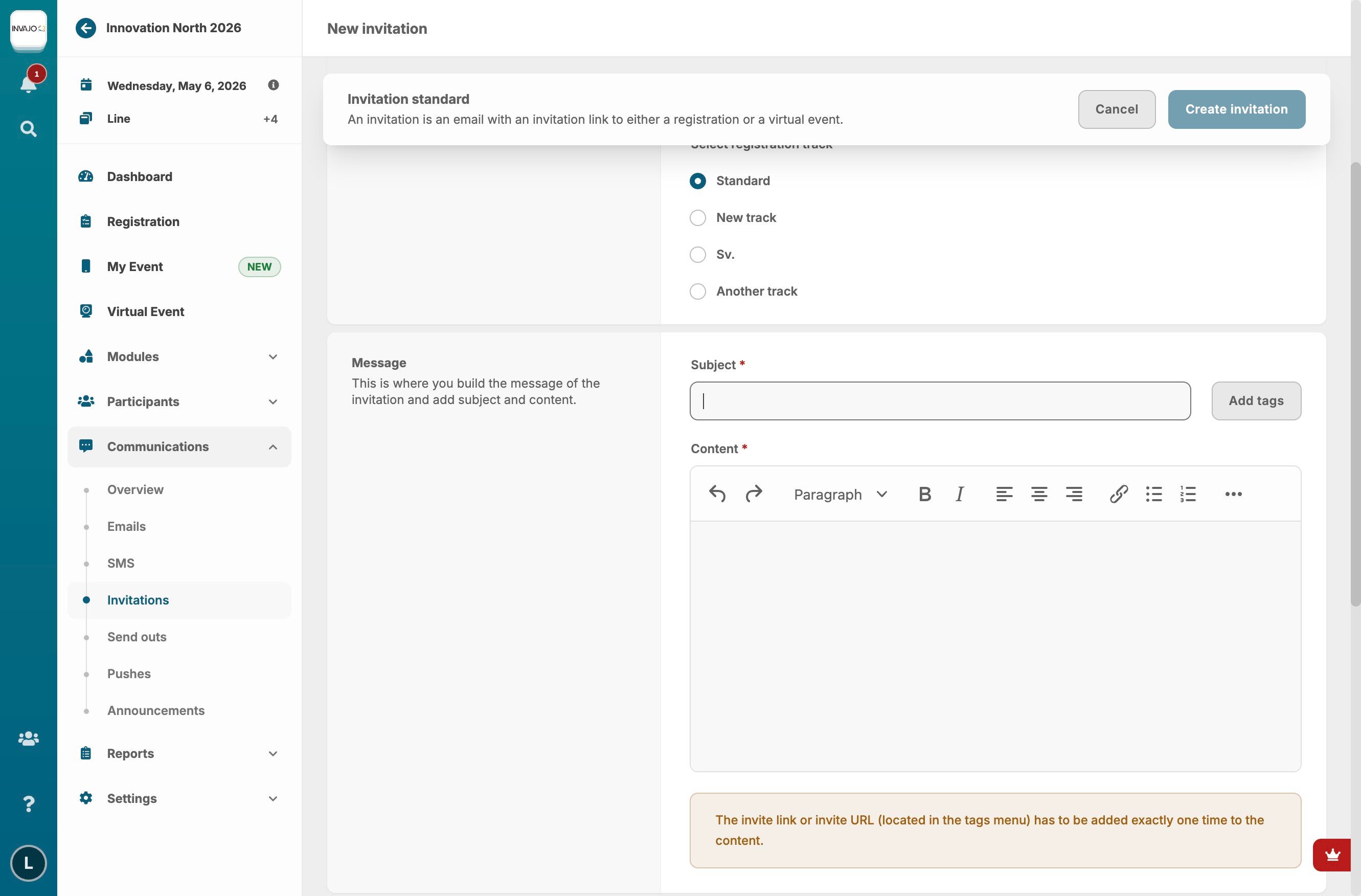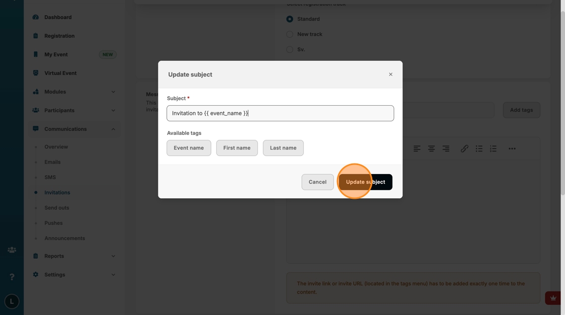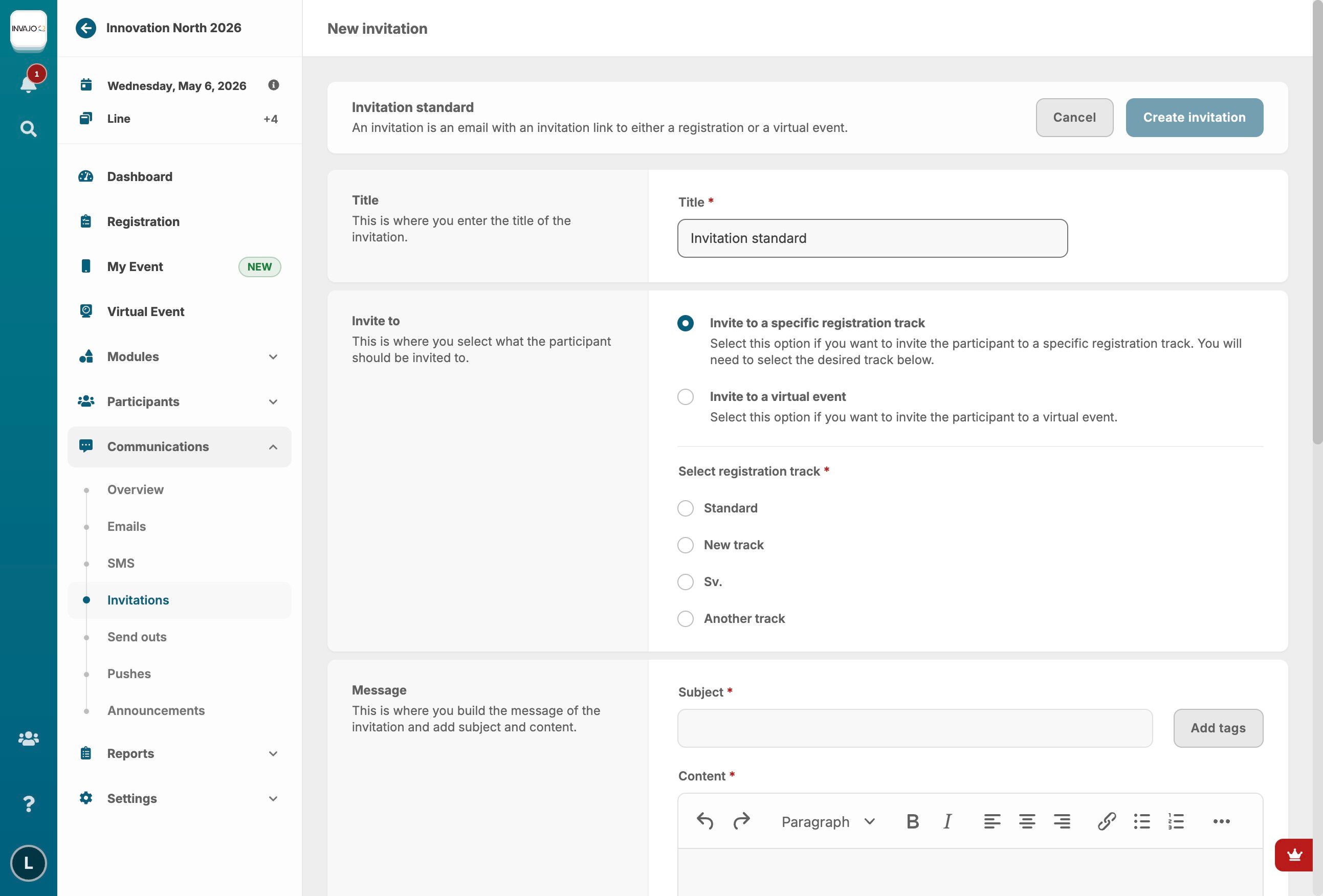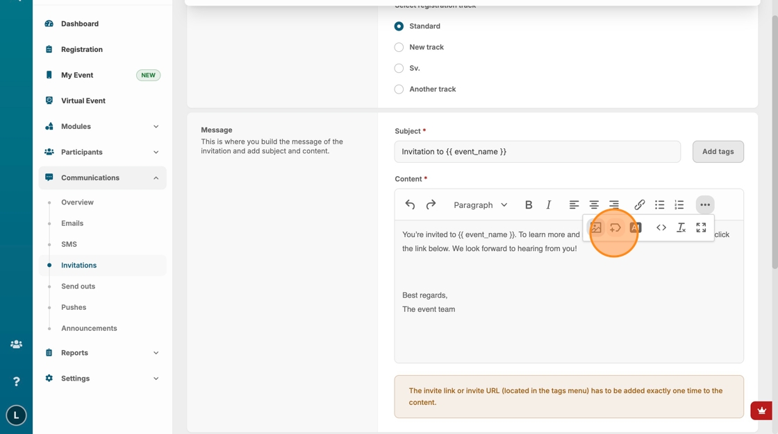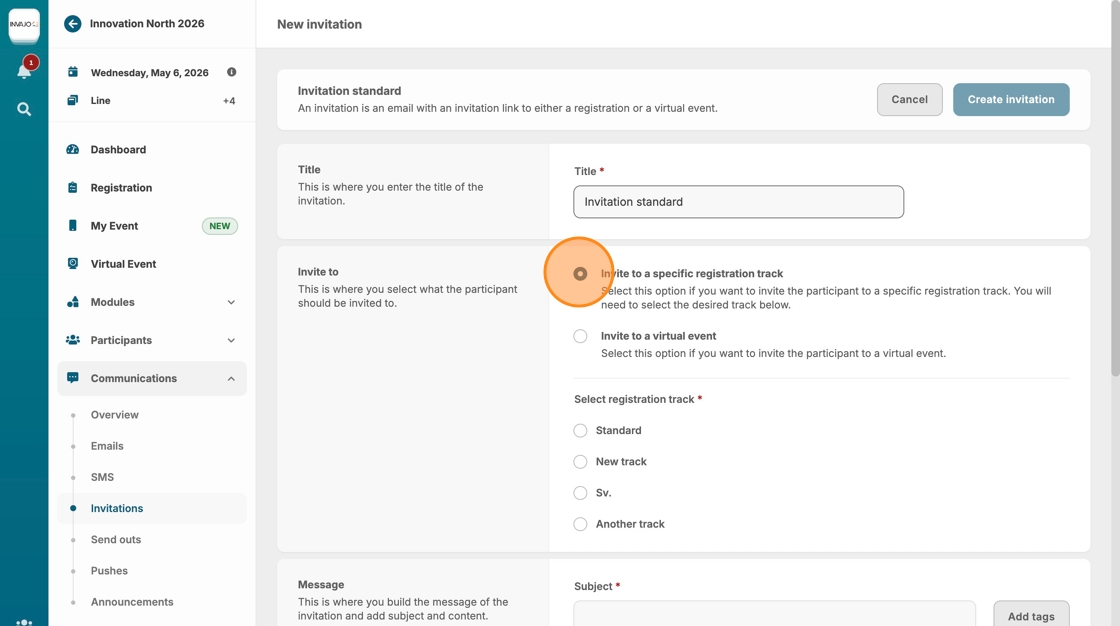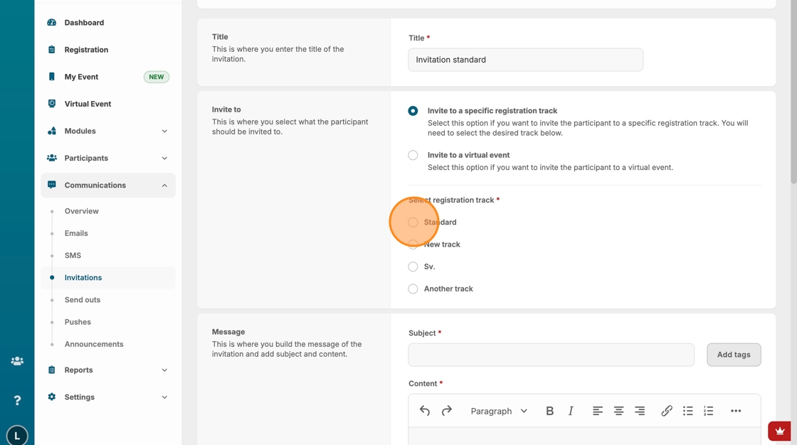 6. Select the registration track you’d like to send an invitation for. In this example, the track is called "Standard."