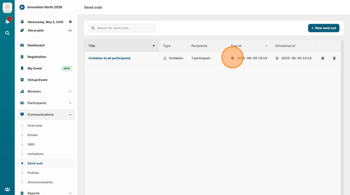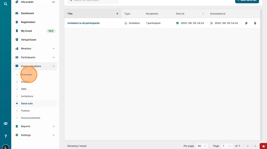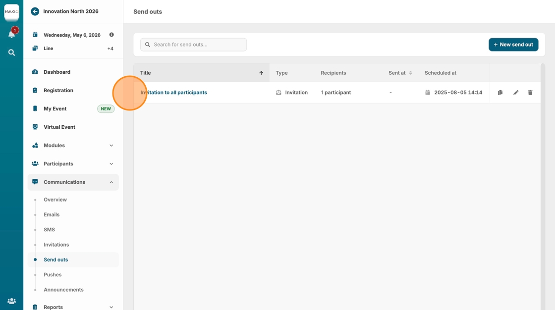 28. Click "New send out Title Type Recipients Sent at Scheduled at Invitation to all participants Invitation 1 participant-2025-08-05 14:14Showing 1 r..."