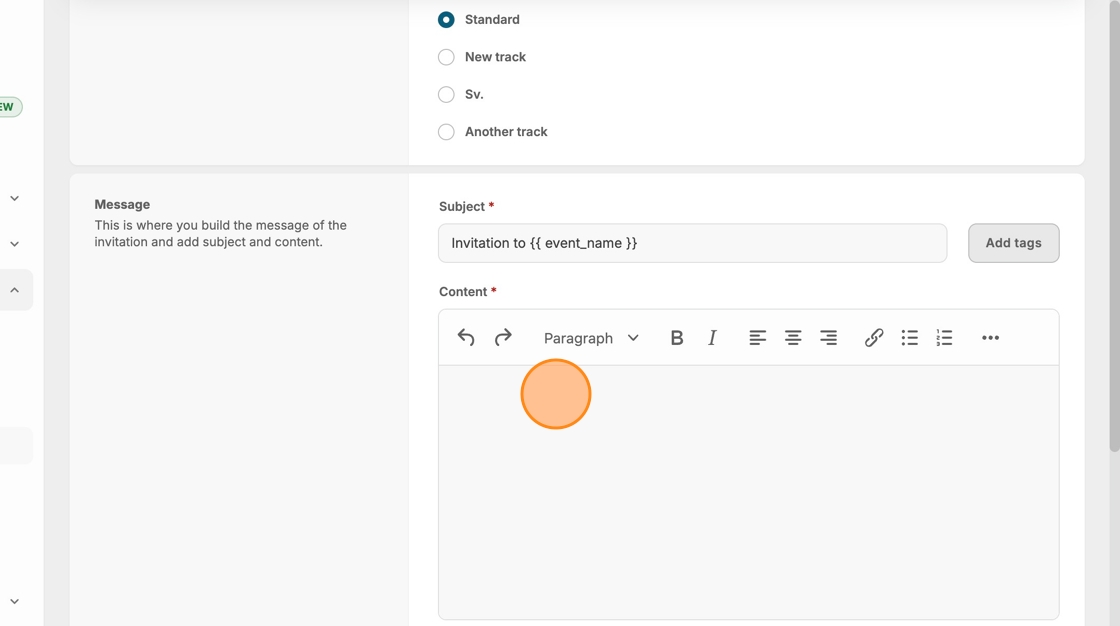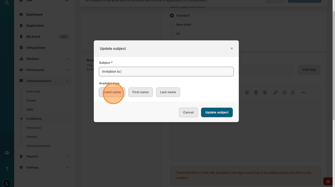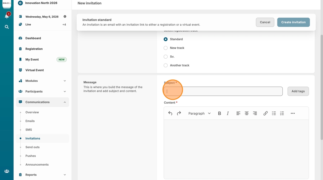 7. Click on the "Subject" field and enter your preferred subject line for the email invitation.
