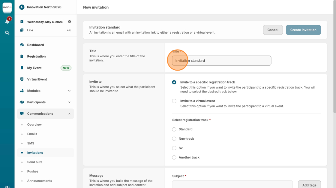 4. Click on "Title" and enter the internal name of the invitation. This title is for internal use only and will not be visible to participants.
