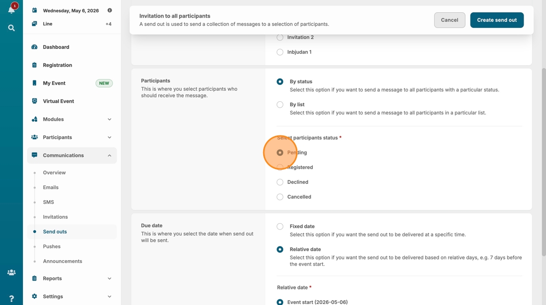 24. Click the "Pending" field to send the invitation to all participants who have been imported and/or still have a pending status.