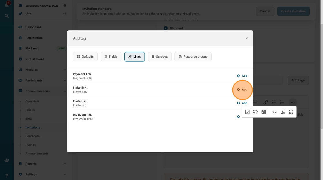 [[invite_url ]]= Inserts the raw URL to the participant’s personal invitation. Best used when you want to display or copy the full link. Alternatively, to make it a clickable hyperlink with custom link text, use the Insert/Edit Link tool and paste the event tag ({{ invite_url }} into the URL field instead of a static web address.