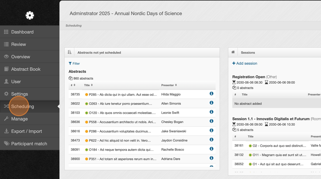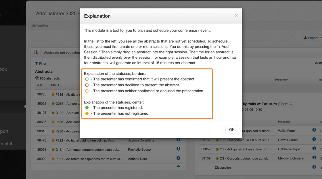 - Outer circle: Indicates whether the author has confirmed the presentation via the notification email, or whether an administrator has done so on their behalf.