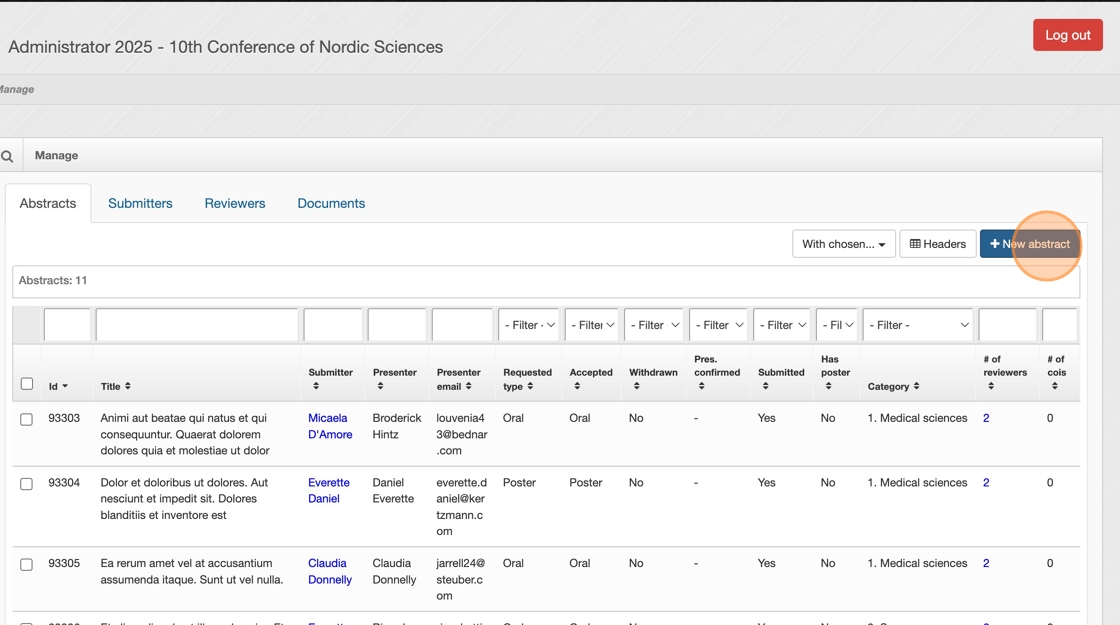 3. To submit an abstract on behalf of someone, click the "+ New abstract" button.